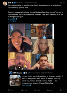 2025年12月、フィンランドの「つり目ポーズ投稿」騒動が、ネット上で話題になった。これはフィンランドの著名人や政治家らが、アジア人を連想させる「つり目」のジェスチャーをSNSに投稿したことをきっかけに、国際的な批判が広がったものだ(前編記事はこちら)。